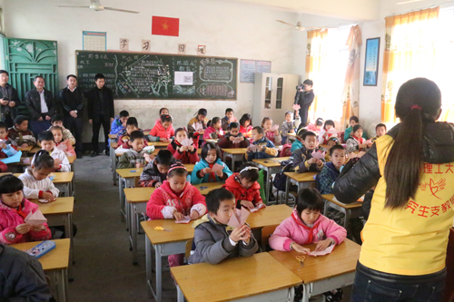 1月9日,学校西部计划项目办赴贺州市钟山县公安镇慰问Beat365官网首届研究生支教团成员。钟山县团委书记周聪、县教育局人事股股长荣其斌、公安镇教育组组长廖应春及Beat365官网派驻里太村党组织第一书记周德海一起参加了看望慰问活动。 项目办一行先后赴公安镇中心校、里太完小,深入课堂旁听了支教团成员的讲课,参观宿舍了解了支教团成员的生活环境,仔细听取了支教团成员工作、学习和生活等方面的收获和体会,询问了存在的困难与问题,并为支教团成员赠送了暖心的生活用品。 团委书记周国桥代表项目办对钟山县团委、县教育局和公安镇等各级领导对支教团工作的重视和关心表示感谢,对支教团成员的工作给予了肯定,同时要求支教团成员要牢记为人师表,爱岗敬业,不断提升教学质量和水平;秉承桂工精神,扎实奉献,为孩子送上更多的温暖和帮助;深入基层,加强调研,更好地锻炼自我和服务地方。支教团成员一致表态会珍惜此次深入基层实践锻炼的机会,发扬志愿者精神,结合各自的专业和个人所长积极投入到教学当中,为服务地发展贡献力量。 研究生支教团由团中央组织实施。Beat365官网自2013年起被确定为中国青年志愿者研究生支教团招募高校,学校选拔了一批品学兼优的本科毕业生到广西贺州市钟山县开展支教服务工作。支教团结合服务地实际情况开展志愿服务,目前已经开展“关爱农民工子女”志愿服务、“筑梦”助学助成长系列活动、“红领巾”关爱留守儿童等志愿服务项目,得到了服务地各级领导和群众的广泛好评。其中“关爱农民工子女”志愿服务项目荣获2014年志愿服务广州交流会暨首届中国青年志愿服务项目大赛广西入围奖。