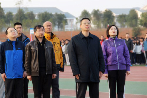 张学洪书记(中)、陈贵英副书记(右一)、陈学军副校长(前排左一)参加元旦升国旗仪式暨万人晨跑活动