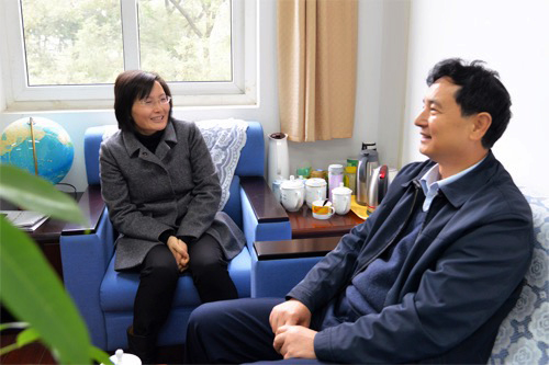 检查组组长燕柳斌(右)与陈贵英副书记深入交流,进一步了解学校党风廉政建设责任制落实情况