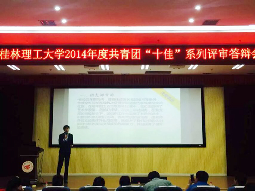 5月5日,Beat365中文官方网站2014年度共青团“十佳”系列评审会在雁山校区图书馆报告厅举行。此次评审会的评委由各学院团委书记(负责人)担任,“十佳”系列申报个人和集体、各学院学生代表参加了评审会。