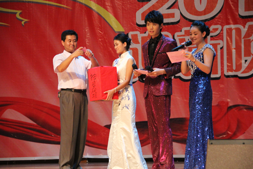 校长助理、高职学院王文院长在晚会互动环节为学生抽奖