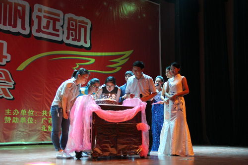 校领导为晚会当天生日的同学送上蛋糕和祝福