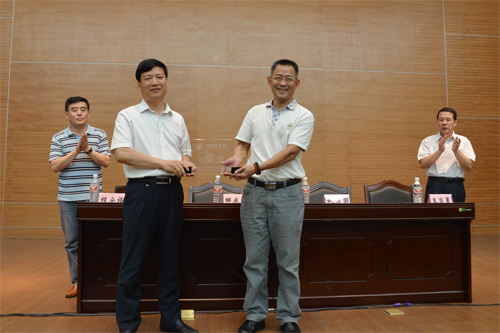 解庆林校长(左)为桂林校友会颁发水晶证书