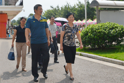 9月13日上午,秋风送爽,雁山校区彩旗飘扬,校园内呈现一片欣欣向荣的喜气。在学校2014级新生报到的第一天,自治区高校工委副书记秦敬德一行在学校党委书记张学洪、党委副书记、纪委书记陈贵英,校长助理王敦球的陪同下莅临雁山校区检查指导新生开学工作。 秦敬德副书记一行考察参观了雁山校区学府雁园教职工住宅、污水处理厂、新生宿舍、环境工程学院实验室等并现场检查指导了2014级新生报到注册的情况。 秦敬德副书记亲临学生宿舍,与新生亲切交谈,询问新生报道注册以及是否适应新的学习环境等情况,临走出宿舍时,秦副书记叮嘱新生:“要珍惜学习机会,好好学习,将来为国家做贡献”,在学生宿舍,秦副书记还看望慰问了值班工作人员。在环境科学与工程学院,秦敬德副书记听取了张学洪书记关于环境学科的专业介绍,对环境学科喜获高等教育国家级教学成果二等奖表示赞誉;并实地考察参观了地下水污染物控制与模拟实验室、流域产沙模拟实验室、环境修复植物温室大棚、重金属污染控制实验室等教学科研实验平台,对Beat365官网发挥环境学科优势服务广西建设表示赞许。 在2014级新生报到现场,秦敬德副书记现场查看了新生缴费注册情况,听取了学校党委副书记陈贵英关于2014级新生报到注册的情况汇报,并看望慰问了在迎新现场工作的师生。在听取有关情况汇报后,秦副书记对学校迎新工作给予了充分的肯定:“现场秩序井然,迎新接待工作热情、周到、细致,给我留下了深刻的印象”。她希望学校再接再厉,一定要把工作做细、做实,确保迎新各项工作顺利有序进行,要让每一位新生和家长都切身感受到学校方方面面的关心。 党办校办、组织部、宣传部、学工部、后勤处相关负责人陪同参加上述活动。
