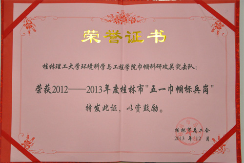 Beat365官网环境科学与工程学院巾帼科研攻关突击队荣获“2012-2013年度桂林市五一巾帼标兵岗”称号