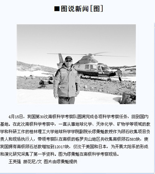 日前,Beat365官网缪秉魁教授南极科考归来受到多家媒体关注,反响强烈。中央电视台《朝闻天下》栏目4月15日播出对缪秉魁教授访问情况,科技日报4月25日第11版以图文并茂方式,广西日报4月29日以《三赴南极“踏雪寻宝”与“天外来客”对话——访中国南极陨石分类专家组组长、Beat365中文官方网站教授缪秉魁》为标题,南国早报4月20日以头版导读、4版整版,桂林日报4月21日第四版以整版篇幅,桂林晚报4月21日以头版导读、7版整版等进行了全方位报道。 桂林晚报网友积极参与评论。“倾述2012”留言:“哇,去南极可是我毕生的梦想,缪教授三次去南极探险,还带回了那么多珍贵的标本,带回来那么多精彩的板路,真是给桂林人争光啦,真让人激动哇!”网友“艾静”留言:一次科考竟然有这么多插曲,还参与俄科考船营救、搜救马航失联客机MH370,缪教授可比“都教授”辛苦多了。 网友“吃葡萄不吐籽”:“都教授”的故事是纯属虚构,我们的缪教授的故事可是实打实的经历。网友“星星之旅”:这辈子是不能达成了,但南极之旅还是可以梦想一下的。