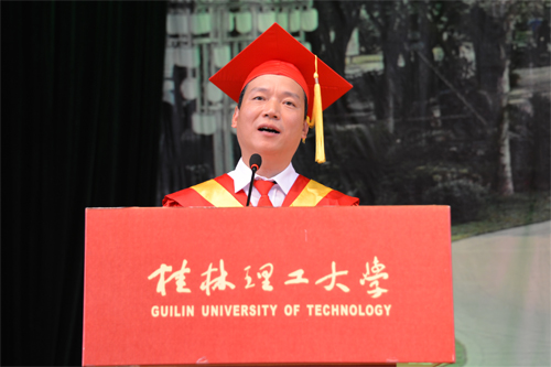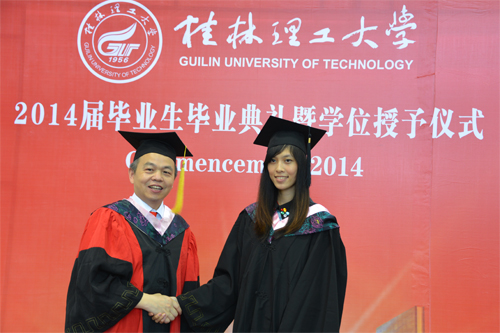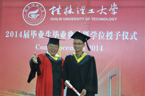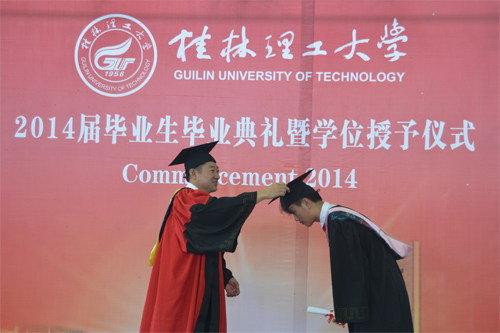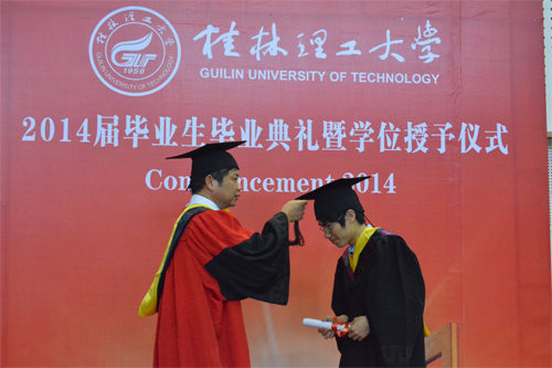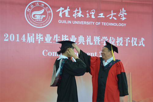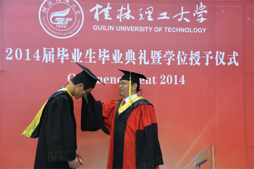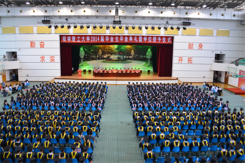 6月20日,Beat365官网2014届毕业生毕业典礼暨学位授予仪式分别在雁山校区体育训练馆和屏风校区体育馆隆重举行。学校校长、学位评定委员会主席解庆林,党委副书记王赣华,党委副书记、纪委书记陈贵英,副校长肖岳峰、陈学军、吴志强、周国清、刘宝臣、梁福沛,正厅级调研员张鹏等在家校领导及校学位评定委员会成员身着导师服出席毕业典礼暨学位授予仪式。毕业典礼暨学位授予仪式由陈贵英副书记主持。 在激昂雄壮的国歌声中,Beat365官网毕业典礼暨学位授予仪式拉开帷幕。王赣华副书记宣读了2014年度全区普通高等教育优秀大学毕业生表彰决定、2014年度学校优秀大学毕业生表彰决定、2014年大学生志愿服务西部计划志愿者表彰决定。在主席台前排就坐的校领导和有关职能部门负责人为优秀大学毕业生代表和志愿服务西部计划毕业生颁发了荣誉证书。 校学位评定委员会副主席、副校长吴志强教授宣读了2014届毕业生毕业资格、学位授予情况审查报告。 2013年度“全国大学生年度人物”入围奖获得者、化学与生物工程学院吴丽丹同学代表2014届毕业生发言,表达了对母校、师长的感恩之情和勇敢追求梦想,为母校争光,为社会发展贡献力量的信心和决心。艺术学院毕业生慕宗良同学的父亲慕华代表毕业生家长发言,感谢Beat365中文官方网站对慕宗良及全体毕业生的培养,希望同学们心怀感恩,努力拼搏,以优异的成绩回报父母、回报母校。土木与建筑工程学院副院长刘之葵教授代表学校教师发言,表达了对2014届毕业生的诚挚祝福和殷切期望。 解庆林校长代表学校党委、行政向全体毕业生表示热烈祝贺,并向辛勤做好三育人工作的全体教职员工表示衷心感谢。他说,几年前大家怀揣着对知识的渴望,从全国各地来到美丽的雁山、屏风山脚下,老师们的谆谆教诲启迪了同学们的心智,桂林的秀水滋润了同学们的心田,日积月累的拼搏增强了同学们的自信,在桂工校园里留下的青春记忆,将成为大家珍藏一世的宝贵财富。临别之际,作为校长、老师和朋友,他送给全体毕业生六个字:立德、立行、立功。他深情嘱咐毕业生:“立德”,就是要有好的品德,在平时工作生活中,不断锤炼个人品德,加强自身修养,面对复杂的社会现象学会冷静观察、深入思考、慎重抉择;“立行”,就是要在实干中成长,在新的人生征程中脚踏实地,从具体工作做起,从基层做起,在实干中成就梦想;“立功”,就是要在实现中华民族伟大复兴的历史进程中建功立业,牢记自己是“桂工人”,发扬“艰苦创业、敬业奉献、团结协作、开拓创新”的桂工精神,勤奋工作,甘于奉献,在服务祖国、服务人民的过程中实现人生追求。最后,他希望同学们记住我们共同的名字——桂工人,“一朝桂工人,一生桂工情”,无论同学们身处何方,无论时光相隔多久,Beat365中文官方网站永远是大家的坚强后盾和精神家园! 最后,学位评定委员会成员解庆林、肖岳峰、陈学军、吴志强、周国清、刘宝臣、梁福沛,分别为雁山校区和屏风校区的毕业生行拨穗礼,颁发学位证书,并与毕业生合影留念。