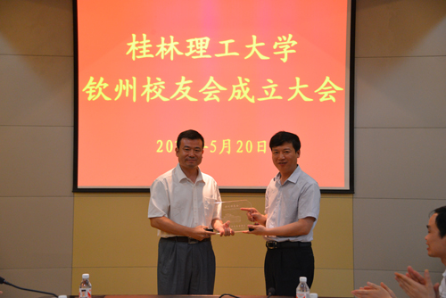 解庆林校长(右)向钦州校友会颁发水晶证书