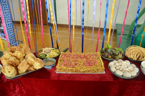 解庆林校长(前左二)、马克萨特总领事(前右)品尝吉尔吉斯特色美食