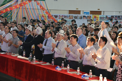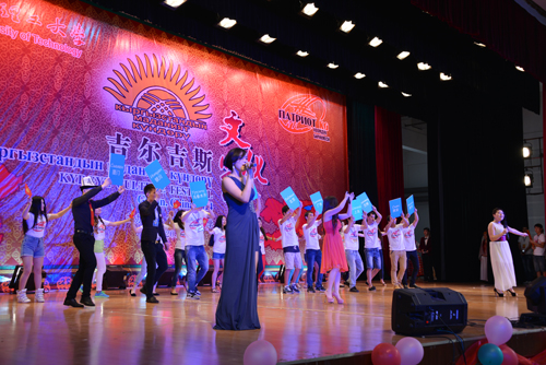 当吉尔吉斯留学生演唱《我的祖国吉尔吉斯斯坦》时,全体观众起立为他们鼓掌致意