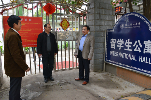 周国清副校长(右)在国际教育学院负责人的陪同下检查和指导留学生公寓