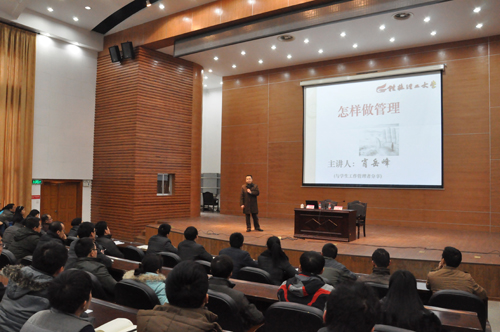 1月6日下午,学校副校长、学生工作领导小组副组长肖岳峰教授在屏风校区图书馆报告厅为学校辅导员、班主任培训班学员作题为《怎样做管理》的报告。学校党委副书记、纪委书记陈贵英,全体辅导员以及2013级班主任一同聆听了报告。 肖副校长从“什么是管理、解读我们的工作、善待工作、人生感悟”等四个方面,结合自身从事管理工作的深刻体会和饱含哲理的人生感悟向老师们讲述了做好管理工作特别是做好学生管理工作的理念、方法和技巧。整场报告,既有理论深度,又与实际工作相结合,使大家深受启发和教育,为辅导员、班主任今后开展好学生工作提供了宝贵的经验。