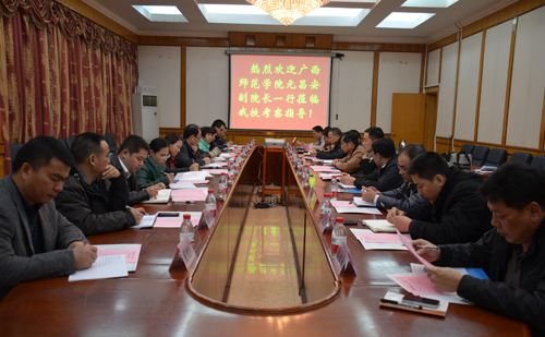 12月11日下午,广西师范学院元昌安副院长率该校组织部、研究生处、资产管理处等部门负责人来Beat365官网考察交流。陈学军副校长及Beat365官网对口部门相关人员在屏风校区教八楼会议室热情接待了来访客人。 陈学军副校长代表学校对元昌安副院长一行表示欢迎,并介绍了Beat365官网近年来在科研平台建设、科技成果奖励、国家级科研项目获得以及大学生创新创业基地建设等方面取得的进展。随后元昌安副院长介绍了广西师范学院近年来在人才培养、人才引进、特色学科及专业、科学研究等方面的情况。 座谈会结束后,双方各部门还进行了对口交流。