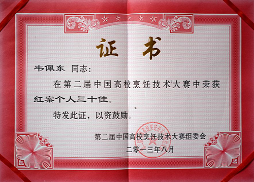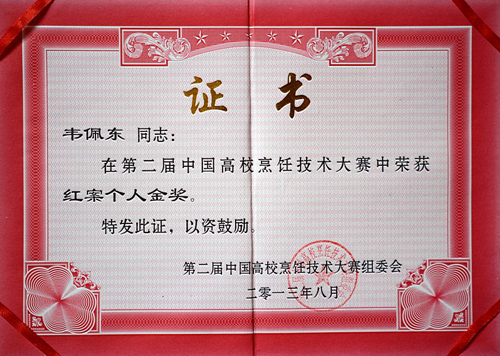 第二届中国高校烹饪技术大赛红案个人金奖