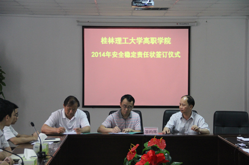 4月16日下午,高职学院在空港校区行政办公楼204会议室召开2014年度安全稳定工作会议。副校长肖岳峰,校长助理、高职学院院长王文出席会议并讲话,该院其他领导班子成员及各单位、部门主要负责人参加。会议由该院党委副书记黄润均主持。 会上,该院罗雪平书记传达了学校2014年度安全稳定工作会议精神,重点强调了学校2014年度安全稳定工作的具体安排、要求以及解庆林校长在会上的讲话精神。该院梁锦叶副院长简要回顾该院2013年安全稳定工作取得的成绩,主要对2014年安全稳定工作具体任务进行了安排部署。 该院党委常务副书记梁冬松、副院长梁锦叶代表该院与土木与测绘工程系、后勤管理部等单位、部门代表签订了安全稳定工作目标管理责任书和安全文明校园创建责任书。 校长助理、高职学院院长王文就做好该院安全稳定工作提出四点要求:一是要高度重视,进一步强化师生的安全责任意识;二是要加强教育,夯实校园安全稳定的思想基础;三是要狠抓落实,强化执行校园安全稳定措施;四是要完善机制,加大监督检查工作力度。 副校长肖岳峰就进一步做好该院的安全稳定工作提出六点指导意见:一是要从提高思想认识的角度,增强校园安全意识;二是要以做好防范工作为重点,积极避免各种常见校园安全事故发生;三是要做好应急预案的编制和演练工作,加强处理突发性事件的能力;四是要充分利用科学技术手段,做好技术防范保障校园安全;五是要健全管理制度,确保安全责任落实到位;六是要采取有效手段,防止邪教在校园滋生蔓延。肖副校长强调,要牢固树立“安全稳定压倒一切”的思想,落实好校园安全稳定责任制度,积极创建平安、和谐、文明的校园环境。