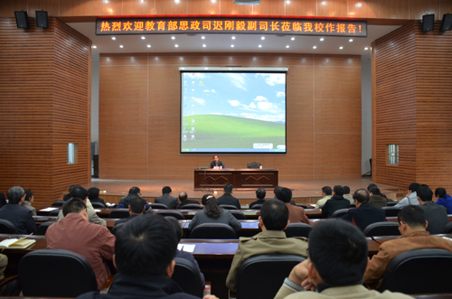 12月2日上午,教育部思政司迟刚毅副司长莅临Beat365官网,在屏风校区图书馆报告厅作题为“高校维稳工作的形势与任务”的辅导报告。迟刚毅副司长从认清形势、强化忧患意识,正视现状、强化紧迫意识,找准定位、强化大局意识,明确任务、强化责任意识四个方面对高校安全稳定工作提出了要求,为Beat365官网的安全稳定工作和大学生思政政治教育工作指明了方向。 解庆林校长出席报告会,学校党委副书记、纪委书记陈贵英主持报告会。各职能部门处级干部,各学院党委书记、副书记、院长及部分学工干部聆听了辅导报告。