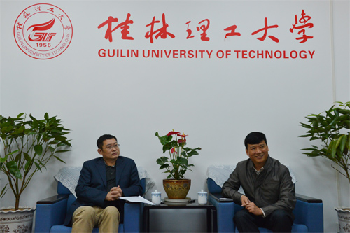 解庆林校长(右)在一会议室会见中国农业银行广西区分行副行长于建忠(左)一行