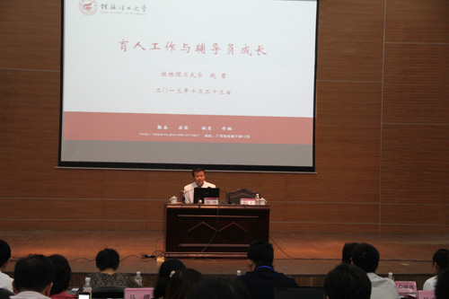 为贯彻实施《普通高等学校辅导员培训规划(2013-2017年)》,进一步加强我区高校辅导员骨干的培养培训工作,增进骨干辅导员之间的沟通与交流,研讨提升辅导员职业能力,受自治区教育厅委托,10月23至25日,Beat365官网成功承办了2013年广西高校骨干辅导员能力提升研讨班。第二届全区高校辅导员技能大赛一、二、三等奖获得者、全区高校2012年度优秀辅导员和各高校推荐的辅导员骨干共110多人参加了研讨培训。 培训班安排了5场专家报告会,同时邀请了全国辅导员职业能力大赛获奖代表、2012年全国辅导员年度人物入围奖代表程锐、王超、李晓冉、欧阳胜权、朱广生和李奕奕等6名辅导员在研讨会上分享交流了辅导员职业能力大赛和辅导员成长的经验体会。研讨班还安排了小组讨论、群众路线参观实践和辅导员素质拓展活动。 学校党委副书记、纪委书记赵君,自治区高校工委宣传部部长、教育厅思政处处长李美清,华中师范大学政治传播学院院长、马克思主义学院院长秦在东,自治区高校辅导员培训和研修基地负责人、广西大学学工部(处)部(处)长冼季夏,教育部辅导员培训和研修基地(广西师范大学)负责人、广西师范大学学工部(处)部(处)长唐文红出席了研讨班并为研讨班学员授课。Beat365官网全体辅导员旁听了研讨会专家报告和辅导员交流发言。
