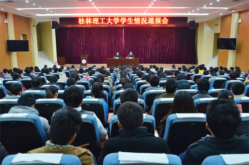 1月14日上午,学校在雁山校区图书馆报告厅召开2013年度学生情况通报会。学校党委副书记、纪委书记陈贵英出席会议。会议由学生工作部(处)长唐壮东主持。 陈贵英副书记代表学校党委和行政分别从三个方面向与会学生代表详细通报了2013年度学校的主要工作成效和下一步学校学生工作的主要方向。一是围绕主线、突出重点,党的建设科学化水平不断提高。教育实践活动成效明显;思想政治建设深入推进;组织建设取得新进展;党风廉政建设扎实有效。二是真抓实干、拼搏奋进,学校事业不断取得新发展。教学与人才培养工作成效显著;科研工作取得重大突破;学科建设和研究生教育成绩喜人;师资队伍建设取得新成绩;校园综合建设水平稳步提高。三是立德树人,不断提升服务学生工作实效。认真抓好学风建设工作;高度重视贫困生工作;全力抓好服务学生学习生活的各项工作,毕业生就业稳中有进;大力加强服务学生创新创业的工作。陈副书记表示,学校将高度重视,采取有力措施,进一步努力改善同学们的学习和生活环境,希望同学们能够一如既往地参与和支持学校建设发展并多提宝贵意见和建议,相信在全校广大师生的共同努力下,桂工的明天一定会更加美好! 与会学生代表在认真听取情况通报会后,对学校2013年度各项事业取得的成绩感到由衷高兴,现场不时响起阵阵热烈的掌声。 最后,陈副书记向与会的学生代表致以新年问候,并希望通过与会学生代表向全校广大同学致以新年的良好祝愿,祝愿大家新年快乐、学习进步,身体健康、家庭幸福! 学校党办、团委负责人;各学院党委副书记、辅导员及学生代表300多名参加了会议。