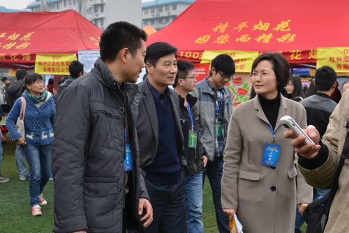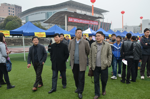 学校党委书记张学洪(前排右二)、校长解庆林(前排左二)、自治区就业指导中心主任蒋瀚洲(前排右一)、自治区教育厅学生处副处长慕朝京(前排左一)等在现场指导工作