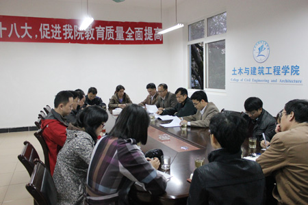 11月8日,陈学军副校长到土木与建筑工程学院开展“喜迎十八大,促进学校教学质量全面提高”调研活动。土木与建筑工程学院领导班子成员及各教研室主任和教师代表参加了座谈会。会议由土木与建筑工程学院吕海波常务副院长主持。 会上,土木与建筑工程学院班子成员对前期教学质量的调研工作情况进行了汇报。各教研室主任汇报了各教研室前期学习《关于全面提高教育质量振兴广西高等教育的若干意见(征求意见稿)》等4个文件的情况,也对在教学过程中教学质量方面存在的问题及采取的措施进行了汇报。陈学军副校长在会上强调:要按照自治区、学校的整体安排和部署,强化对师资队伍建设、教育教学质量、学生科研建设等方面,查找不足,明确思路,提早谋划,准确定位,真抓实干,充分发挥学科建设的优势、提升办学特色,为推动土木与建筑工程学院的进一步发展而努力,为建设特色鲜明的高水平理工大学做出应有的贡献,献礼党的十八大。