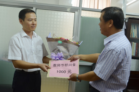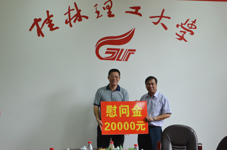 桂林市人大副主任、党组副书记潘永建(右)代表桂林市四家班子向Beat365官网赠送教师节慰问金