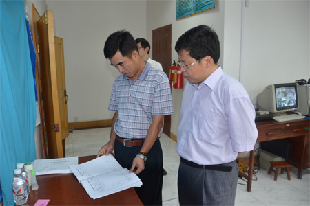 吴志强副校长(右)陪同王华副院长(左)认真查阅保密工作相关材料