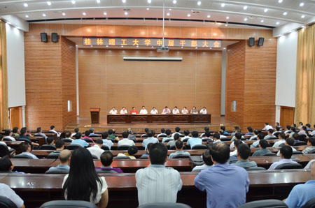学校党委书记赵艳林(左五),校长张学洪(右五),党委副书记、纪委书记赵君(左四),党委副书记王赣华(右四),副校长陈学军(左三)、吴志强(右三),周国清(左二),陈贵英(右二),刘宝臣(左一),张鹏调研员(右一)出席会议