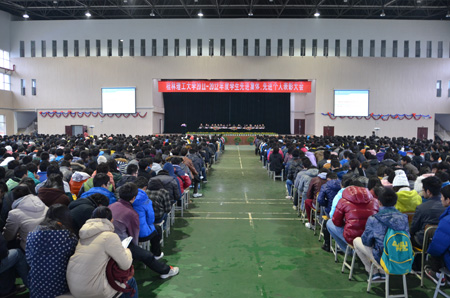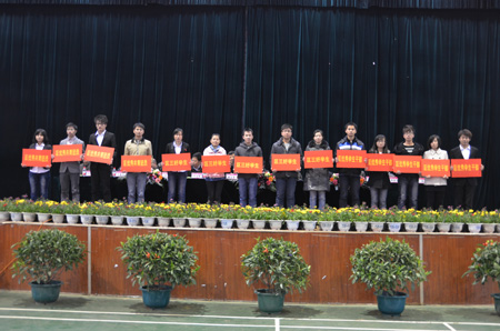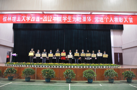 12月26日下午,学校在雁山校区体育馆隆重举行2011-2012年度先进集体、先进个人表彰大会,共有39个先进集体、千余名先进个人受表彰。校长解庆林、校党委副书记王赣华,副校长吴志强出席会议。学工处、教务处、校团委负责人,各学院党委书记或院长、副书记、辅导员、获奖学生及学生代表等参加了此次大会。 大会在庄严的国歌声中拉开帷幕。首先,吴志强副校长宣读了2011-2012学年度国家级、自治区级、校级学生先进集体、先进个人表彰决定,在主席台前排就座的领导为先进集体和先进个人代表颁奖。土木与建筑工程学院傲霜同学和管理学院陈德硚同学分别代表先进集体、先进个人发言,向辛勤培育他们的学校和老师表示衷心的感谢。 解庆林校长代表校党委、行政向获奖集体和个人表示祝贺,并对广大同学提出了五点希望:一是希望坚守理想,做信念坚定的有志青年;二是勤奋学习,做善于思考的有才青年;三是遵纪守法,做严于律己的文明青年;四是甘于奉献,做品格高尚的有德青年;五是勇于实践,做敢于创新的有为青年。解庆林校长希望广大青年要积极树立正确的世界观、人生观、价值观,把个人成长融入到民族复兴的伟大事业中,将来创造无愧于人民、无愧于时代的业绩。 王赣华副书记主持表彰会,他希望受表彰的同学珍惜荣誉,谦虚谨慎,充分发挥自己的先进表率和模范带头作用;希望全校学生以受表彰的同学为榜样,戒骄戒躁,顽强拼搏,勤奋学习,从现在做起、从自我做起,努力成为德智体美全面发展的高素质人才。