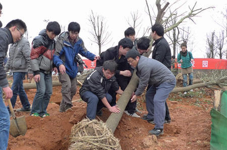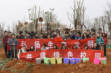 为贯彻落实自治区文明办《关于组织开展“关爱自然、义务植树”志愿服务的通知》和教育厅《关于做好2012年继续在我区学校开展“千校植万树”活动的通知》,以实际行动推进“绿满八桂”造林绿化工程建设和生态文明示范区建,迎接第34个全国植树节的到来,根据学校工作部署,3月10日上午,学校团委组织师生在雁山校区开展了“弘扬生态文明,共建绿色校园”主题校园义务植树活动。 经过师生近三个小时的共同努力,原来的黄土地变成了一片小树林,30余棵香樟树在雁山校区安了家,一棵棵树苗都已经扎根沃土,在风中轻轻摇曳,尽现勃勃生机,为学校又新添了一处靓丽的风景。