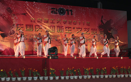 齐欢聚,共起航。恰逢国庆来临之际,为迎接2011级新生到来,一场以“丹桂飘香共聚首,激扬青春谱华章”为主题的2011年迎新生文艺晚会在学校雁山校区大操场隆重举行。学校校长张学洪,党委副书记王赣华,副校长陈学军、吴志强出席并观看晚会,党(校)办,党委宣传部、统战部,学工处(部),校团委,武装部及各学院相关负责人与全体新生一同观看了演出。 王赣华副书记为晚会致辞。他首先代表学校党委、行政向2011级新同学的到来表示热烈的欢迎,希望同学们在这喜气洋洋的夜晚感受到桂工大家庭的温暖,把桂工当成自已谱写青春新华章的起点,勤奋学习,早日报效祖国。 整场晚会形式多样,精彩纷呈。一曲《国家》拉开晚会的帷幕,艺术团合唱队的同学们经过了广西大学生艺术展演的洗礼,表现得越发成熟和自信,他们雄壮浑厚的歌声抒发了满腔的爱国情怀,为庆祝祖国62周年华诞送上桂工学子的祝福;紧接着舞蹈《踩云彩》用灵动优雅的舞姿展现出彩云之南的彝族人民的幸福生活,带动了新生们对美好未来的憧憬;古筝独奏《战台风》如高山流水结合书画协会同学挥笔方遒,引发现场欢呼不断;街舞《keep on dancing》热情洋溢,动感十足,展现了大学生追求时尚的风采;外文歌曲串烧《我和你》,来自不同国籍的留学生们用不同的语言表达对新生的欢迎与友好之情;Beat365官网青年教师蔡茂军老师的独唱《黄种人》、《精忠报国》赢得了全场喝彩;接下来是古朴典雅的服装走秀《霓裳》,美女俊男的组合顿时让整个舞台增色不少;管理学院艺术团的街舞《thriller & too bad》挥舞着青春的魅力,彰显青春的活力,欢快的舞姿使全场的气氛再次活跃起来。最后,晚会在艺术团舞蹈队的《瑶山书梦》的曼妙舞姿中落下帷幕。 晚会期间,张学洪校长还参加了抽奖互动游戏,为同学们送去了美好的祝福。 本场晚会为2011级新生带来了一场视觉与听觉的盛宴,唱响了青春奋进的主旋律,舞出了青春活力的动感节拍,同时也开启了他们大学生活的新篇章。