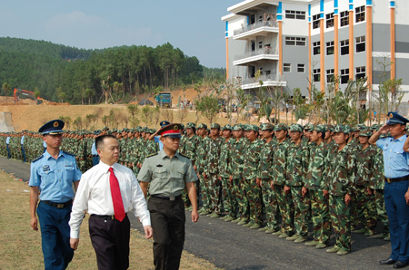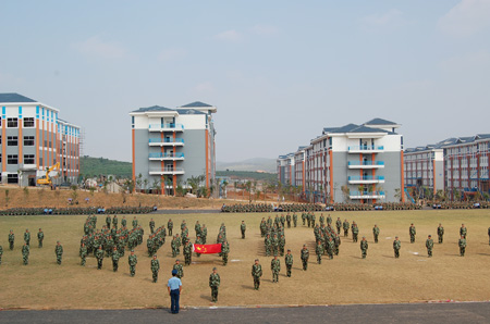 9月28日下午,高职学院在南宁空港校区运动场隆重举行了2011级新生军训阅兵暨汇报表演。空港校区建设指挥部指挥长、副校长肖岳峰,中国人民解放军空军南宁场站副政委张鹏,校长助理、高职学院院长顾炳根,高职学院党委书记王琳娜,空港校区建设指挥部副指挥长、地球科学学院党委书记罗雪平等领导及学院各职能部门负责人出席了本次阅兵典礼。典礼由高职学院副院长梁锦叶主持。 典礼在庄严、嘹亮的国歌声中正式开始。副校长肖岳峰依次检阅了由2011级新生组成的军训连队。随后,身着戎装的各连队踏着高昂的分列式进行曲进行了分列式表演。同学们踏着整齐的步伐,喊着嘹亮的口号,展现出高职学院新生良好的精神风貌。在接下来的军事项目表演中,新生连队分别表演了女子队列操和男子军体拳。整齐划一的动作和训练有素的招式,赢得了全场雷鸣般的掌声。 校长助理、高职学院院长顾炳根在总结讲话中指出同学们出色的表演是本次军训工作取得圆满成功的最佳证明,他代表学院向出色完成军训工作的部队首长和各位教官表示衷心的感谢,并对同学们在这次军训中取得的良好成绩表示热烈的祝贺。他说,2011级新生是南宁空港校区的第一届学生,处于新校区仍在建设过程中的现状,条件相对艰苦,但同学们仍然圆满地完成了各项训练科目,达到了军训的预期目的,事实证明,同学们用汗水换来的收获向学校递交了入学后的第一份合格答卷。 中国人民解放军空军南宁场站副政委张鹏鼓励高职学院学子应该继续发扬一不怕苦二不怕累的革命乐观主义精神,将军训中培养的好思想好作风带到今后的学习生活中去,用实际行动换取更多更好的荣誉和成绩。 最后,高职学院党委书记王琳娜宣布嘉奖令,分别对军训中涌现出来的优秀连队和先进个人进行了表彰。2011级新生军训暨汇报表演在激昂的军歌声中圆满落幕。