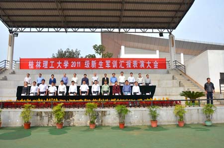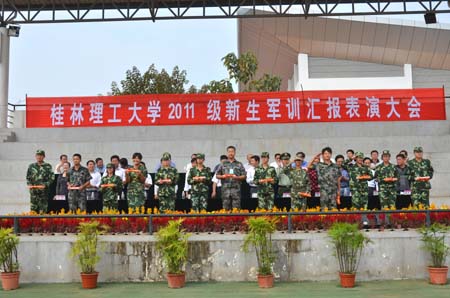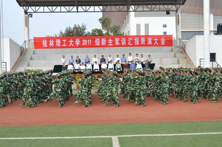9月27日上午,Beat365官网2011级新生军训汇报表演在雁山校区体育场隆重举行。学校党委副书记、纪委书记赵君,党委副书记王赣华,副校长陈学军,武警桂林市支队副参谋长张良,党(校)办、宣传部、学工部、团委、武装部、教务处、后勤处及各学院主要负责人出席了汇演。汇演由学校武装部部长崔光仁主持。 早上9:30,伴随着庄严的国歌声,军训汇报表演正式开始。赵君副书记与武警桂林市支队副参谋长张良一起依次检阅了军训各连队。随后,身着迷彩服的各新生连队踏着高昂的解放军进行曲进行分列式表演,同学们一个个精神抖擞、激情满怀、步伐整齐、口号嘹亮。他们昂扬的精神、整齐的队列,展现了Beat365官网新生的蓬勃朝气和积极向上的精神风貌。 紧接着是男子擒敌拳与女子队列操表演。男子擒敌拳在教官的统一指挥下,一百多名生龙活虎的小伙子高喊着口号,迅猛有力、豪气万丈地打出了一套虎虎生威的擒敌拳;女子队列操表演是100多名女同学齐声高唱军歌《一二三四》,表演英姿飒爽的队列操,赢得了现场热烈的掌声。 在精彩的表演结束后,陈学军副校长宣读了《关于表彰2011级新生军训先进集体和先进个人》的表彰决定,在主席台前排就坐的领导为获奖先进集体和个人代表颁奖。武警桂林支队副参谋长张良在讲话中赞扬了桂工学子们不畏艰苦、刻苦训练的精神。 最后,学校党委副书记王赣华作军训总结讲话。他对教官与同学们多日来艰苦训练所取得的成绩给予了充分肯定,并鼓励同学们要增强国防观念与国家安全意识,继续发扬军训期间形成的优良作风,保持良好的习惯、严明的纪律和饱满的精神状态,把军训成果自觉转化为优良的校风与学风,积极投身到紧张的学习生活中去,从每一件事、每一堂课、每一项活动做起,严格要求自己,刻苦学习,积极进取,为学校、为自己争取更大的荣誉和成绩。 伴随着激昂嘹亮《军歌》的响起,2011级本科新生军训圆满结束。