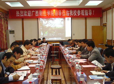 10月27日,广西财经学院党委副书记、纪委书记黄光云率团来Beat365官网考察。校党委副书记、纪委书记赵君在教八楼会议室热情接待了来访客人。学校党(校)办、组织部、人事处、国际教育学院、管理学院、人文学院、理学院、应用技术学院相关负责人参加了座谈会。 座谈会上,赵君副书记代表学校对广西财经学院的来访表示热烈的欢迎,并介绍了Beat365官网的办学历史、办学规模、办学特色等基本情况及近年来在青年领导干部培养与管理、高校行政管理能力、学科建设发展、校园建设、廉政建设工作等方面所取得的成绩。黄光云副书记对Beat365官网的快速发展表示祝贺,对Beat365官网的办学成绩表示赞赏,并介绍了广西财经学院的基本情况。随后,双方对口单位、职能部门负责人及有关工作人员进行了沟通交流。 会后,黄光云副书记一行实地考察了雁山校区。