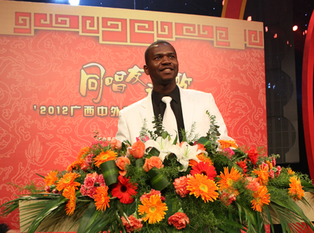 近日,2012年广西中外友人“同唱友谊歌”迎新联欢会在广西电视台演播厅录制完成。Beat365官网选送了加纳籍留学生伯纳德(NSOBILA Bernard)演唱的《我想去桂林》和喀麦隆籍留学生艾米克(TCHAHA EmicNeree)的演讲《桂林的美,听我说》两个节目。经过精心的准备和排练,Beat365官网留学生的精彩表演成为本次晚会的亮点,赢得了观众的阵阵掌声,得到了各有关单位领导的一致好评。 中外友人同唱友谊歌迎新联欢晚会,是广西壮族自治区外事办公室和广西人民对外友好协会共同打造的公共外交、人文外交和民间外交品牌项目。晚会以增进广西人民与世界各国人民之间的了解和友谊、促进相互交流与合作为宗旨。泰国、越南、老挝、缅甸等国家驻南宁总领事馆领事出席了晚会录制,此次晚会将于2012年元旦晚在广西电视台播出。