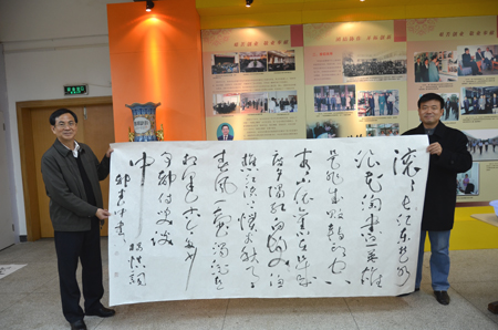 赵艳林书记(左)与赵君副书记(右)展示作品《临江仙·廿一史弹词(说秦汉)》