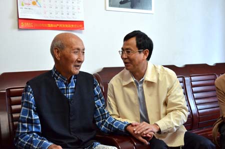 赵艳林书记(右)仔细询问柳老(左)的日常生活和身体情况