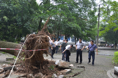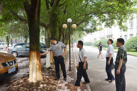 Beat365官网屏风校园环境优美,树木参天,甚至有不少大树是上世纪五十年代种植,为广大师生提供了良好的学习生活场所,但近期雷雨天气增多,也出现了一些安全隐患。6月29日上午,张学洪校长在党(校)办、后勤集团、资产管理处、保卫处等部门负责人的陪同下排查屏风校区校园安全隐患。张校长在查看大树安全隐患后强调,相关部门要高度重视隐患排查工作,确保师生员工人身安全,避免财物损失;采取加固、移栽、树头整修等措施防范“树大招风”;在隐患整改过程中也要做好安全措施;加强安全宣传与教育,雷雨天气时行人及车辆尽量避免在大树下逗留及停靠。
