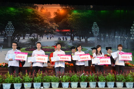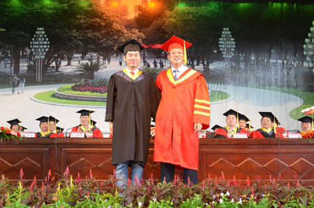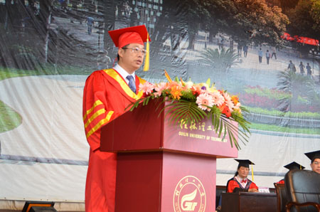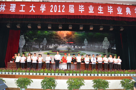 6月22日上午,Beat365官网2012届毕业生毕业典礼暨学位授予仪式在体育馆三楼隆重举行。学校党委副书记、校长、校学位评定委员会主席张学洪;党委副书记、纪委书记赵君;党委副书记王赣华;副校长肖岳峰、陈学军、吴志强、陈贵英、刘宝臣,正厅级调研员张鹏等在校校领导及校学位评定委员会成员身着导师服出席毕业典礼暨学位授予仪式。毕业典礼暨学位授予仪式由王赣华副书记主持。 赵君副书记宣读了2012年度全区普通高等教育优秀大学毕业生表彰决定、2012年度学校优秀大学毕业生表彰决定、2012年大学生志愿服务西部计划志愿者表彰决定。在主席台前排就坐的校领导和有关职能部门负责人为区级、校级优秀大学毕业生代表和2011年大学生志愿服务西部计划学生颁发了荣誉证书和奖金。 校学位评定委员会副主席、副校长吴志强教授宣读了2012届毕业生毕业资格、学位授予情况审查报告。 信息科学与工程学院电子信息工程08-2班蒙国强同学代表2012届毕业生发言,表达了对母校、师长的感恩之情和在新的人生征途中奋发努力、报效祖国、服务人民、为母校争光的决心。环境科学与工程学院院长王敦球教授代表学校教师发言,对2012届毕业生寄予殷殷希冀和真诚祝福。 张学洪校长代表学校党委、行政向全体毕业生致以热烈的祝贺,并向为同学们的成长倾注无数心血和汗水的老师们表示深深的敬意和衷心的感谢。他说,几年前,同学们怀揣着对知识的渴望和对人生的追求,从全国各地来到山水甲天下的桂林,来到美丽的雁山、屏风山脚下,在桂工的校园里度过了你们人生成长过程中最为灿烂的流金岁月。同学们心系民族、胸怀祖国、情牵母校,在上海世博会的成功举办中激发了骄傲和自豪;在与汶川、玉树地震的抗争中学会了真爱和大爱;在神九天宫交汇对接中增强了民族自信心和自豪感;在“小悦悦事件”中抒发着对冷漠的愤慨、呼唤道德的回归;在温州动车事故中学会了责任的担当;在乔布斯的离去中感受着时代的传奇;在支持雁山校区建设中学会了理解与宽容;在为学校“更名”、“申博”奋斗中学会了承担责任与义务,等等……他深情嘱咐毕业生们,踏上新的人生征程,要勇于面对社会挑战,敢于担当社会责任;积极践行“桂工精神”,时刻保持远大理想;树立终身学习观念,提高自身综合素养;诚实守信立世做人,谦虚谨慎立行做事。最后,他希望广大毕业生在离开学校之后,无论身在何方、业立何处,都能永葆母校赋予的优秀品质,以良好的精神状态和突出的业绩为母校增光添彩,大家的成功就是母校的骄傲,就是桂工的至高荣誉。母校永远是广大毕业生的坚强后盾,永远是广大毕业生温暖的家!欢迎同学们常回家看看! 最后,校学位评定委员会主席、学校校长张学洪教授为2012届毕业生代表颁发学位证书,并与毕业生代表一一合影,留下这庄严而难忘的时刻。
