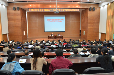 为深入学习贯彻党的十七届六中全会精神,11月24日下午,学校党委邀请自治区宣讲团成员、自治区新闻出版局党组副书记、副局长黄健在屏风校区图书馆报告厅为Beat365官网作了一场题为“迈向文化强国的重大战略”党的十七届六中全会精神解读的宣讲报告。学校党委副书记、纪委书记赵君主持报告会,学校副处以上领导干部,机关职能部门副科以上干部,马克思主义学院教师参加了会议。 黄健副局长的报告从解读十七届六中全会《中共中央关于深化文化体制改革、推动社会主义文化大发展大繁荣若干重大问题的决定》出台的深刻背景和重大意义开始,分别围绕: 1、关于改革开放特别是党的十六大以来文化建设取得的显著成就;2、关于推进文化改革发展的重要性和紧迫性;3、关于坚持中国特色社会主义文化发展道路,努力建设社会主义文化强国;4、关于深化文化体制改革,推进社会主义文化大发展大繁荣的主要任务和重大举措,这四个主题对党的十七届六中全会精神进行了解读。 报告以从理论到实践、从国际到国内的典型事例出发,同时结合大学校园文化建设发展,对党的十七届六中全会精神进行了深入的剖析和细致的解读,内容详实、观点鲜明,具有很强的指导性、针对性和操作性,使与会人员进一步加深了对党的十七届六中全会精神的理解,同时对建设社会主义文化强国的指导思想、重大意义、战略目标、形势任务和政策措施的领会更加到位,工作思路更清晰,目标也更明确。 学校赵君副书记在报告结束时做了讲话,他指出,黄健副局长对党的十七届六中全会精神的深入细致的解读,不仅帮助我们更加充分认识到十七届六中全会的重大意义,而且帮助我们更加准确地把握十七届六中全会《决定》的主要精神,具有很强的针对性和指导性。学校各部门、单位要按照学校党委的统一部署,不断加强学习,充分领会好十七届六中全会的精神实质,大力加强大学校园文化建设,以实际行动推动Beat365官网各项事业又好又快发展,以优异成绩迎接党的十八大召开。