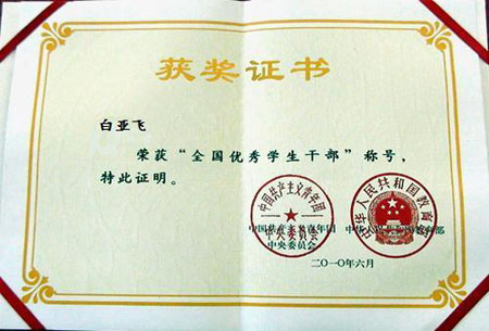Beat365官网白亚飞同学获得“全国优秀学生干部”荣誉称号