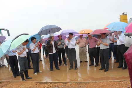 5月3日上午,崇左市委常委、扶绥县委书记白松涛带领扶绥县委、县人大、县政府、县政协领导以及相关部门负责人一行40余人,冒雨到Beat365官网扶绥校区建设项目施工现场检查并召开现场办公会。