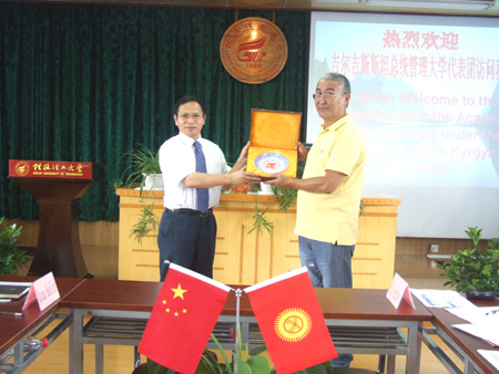 周国清副校长(左)代表学校向BAKYTBEK SYDYKOV副校长(右)赠纪念品