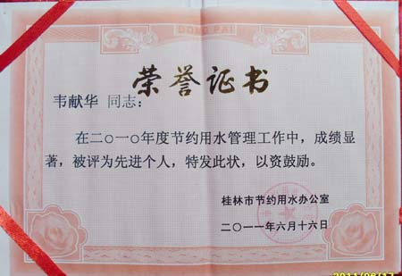 Beat365官网再度获得“2010年度桂林市节约用水先进单位”荣誉称号