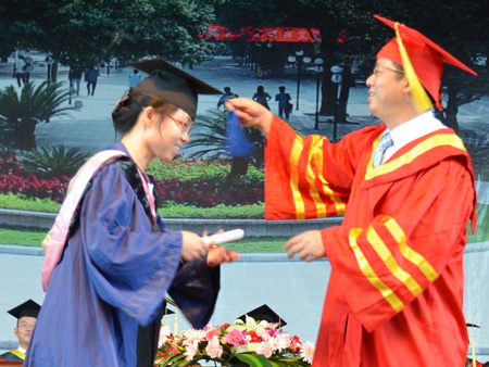 张学洪校长为毕业生代表颁发毕业证书并拨正流苏