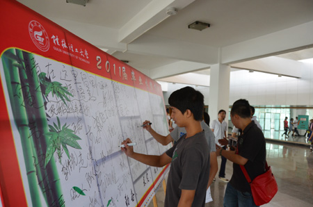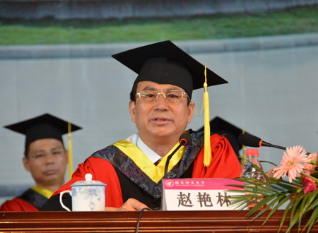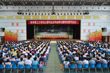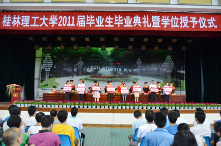 6月24日上午,Beat365官网2011届毕业生毕业典礼暨学位授予仪式在体育馆三楼隆重举行。学校党委书记赵艳林,校长张学洪,党委副书记、纪委书记赵君,党委副书记王赣华,副校长陈学军、吴志强等在校校领导及校学位评定委员会成员身着导师服出席毕业典礼暨学位授予仪式。毕业典礼暨学位授予仪式由王赣华副书记主持。 赵君副书记宣读了2011年度全区普通高等教育优秀大学毕业生表彰决定、2011年度学校优秀大学毕业生表彰决定、2011年学校大学生志愿服务西部计划表彰决定。在主席台前排就坐的校领导和有关职能部门负责人为区级、校级优秀大学毕业生代表和2011年大学生志愿服务西部计划学生颁发了荣誉证书和奖金。 校学位评定委员会副主席、副校长吴志强教授宣读了2011届毕业生毕业资格,学位授予情况审查报告。 艺术学院动画专业07级张萌萌同学代表2011届毕业生发言,表达了对母校、师长的感恩之情和在新的人生征途中奋发努力、报效祖国、服务人民、为母校争光的决心。研究生处处长程道品教授代表学校教师发言,对2011届毕业生寄予殷殷希冀和真诚祝福。 校学位评定委员会主席、学校校长张学洪教授为2011届毕业生代表颁发学位证书,并与毕业生代表一一合影,留下这庄严而难忘的时刻。 赵艳林书记代表学校党委、行政向全体毕业生致以热烈的祝贺,并向为同学们的成长倾注无数心血和汗水的老师们表示深深的敬意和衷心的感谢。他对全体毕业生说:春华秋实,岁月如歌,在几年大学学习的美好时光里,同学们在老师的指导下勤奋学习,在知识的海洋里汲取营养;同学们心系民族、胸怀祖国、情牵母校,在与汶川、玉树地震的抗争中学会了真爱和大爱;在北京奥运会、上海世博会的成功举办中激发了骄傲和自豪;在支持雁山校区建设中学会了理解与宽容;在为学校“更名”、“申博”奋斗中学会了承担责任与义务,你们一路走来,一路成长!他深情嘱咐毕业生们,踏上新的人生征程,要有理想信念,把自己的理想信念与为祖国、为人民做贡献结合起来;要有为理想而奋斗的务实精神,遇到困难,不要气馁,无限风光在险峰;要诚信为人,诚信是人的立身之本,走向社会是广大毕业生书写人生品质的第一步,诚信会赢得信任、赢得朋友、赢得成功。他希望广大毕业生在离开学校之后,无论身在何方、业立何处,都能永葆母校赋予的优秀品质,以良好的精神状态和突出的业绩为母校增光添彩,大家的成功就是母校的骄傲,就是桂工的至高荣誉。母校永远是广大毕业生的坚强后盾,永远是广大毕业生温暖的家!欢迎同学们常回家看看! 今年,Beat365官网2011届各类毕业生总计5023名,其中具有毕业资格的各类全日制毕业生3971人,具有毕业资格的成人教育本专科学生1052人;有8名同学参加西部服务计划;截止目前共有15名硕士研究生被中科院、上海交大、同济大学等单位录取为博士研究生;有62名同学获得区级优秀大学毕业生荣誉称号,252名同学获得校级优秀大学毕业生荣誉称号。