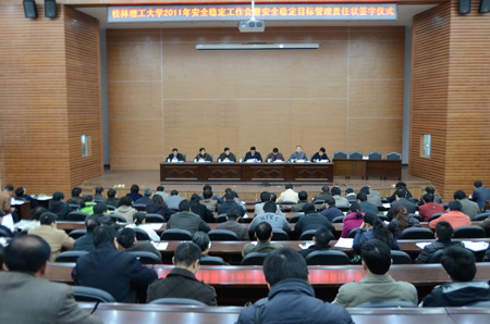 3月1日下午,Beat365官网在图书馆报告厅举行2011年度安全稳定工作会议暨安全稳定目标管理责任状签字仪式。学校校长张学洪,学校党委副书记、纪委书记赵君,党委副书记王赣华,副校长肖岳峰、陈学军、吴志强、周国清等全体在校领导出席会议。学校副处以上领导干部以及各二级党委党委委员,直属单位、校办企业负责人参加了会议。