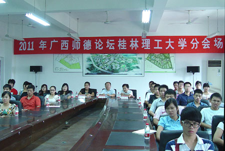 9月7日,在第27个教师节即将来临之际,自治区高校工委、自治区教育厅在南宁组织召开了 “2011年广西师德论坛” 视频会议。Beat365官网作为论坛分会场之一认真组织了收看,学校校长助理、人事处处长华桂林,党委宣传部、统战部,学工处(部)相关负责人,各学院辅导员、专职教师及学生代表在雁山校区4301会议室收看了视频会议。 论坛上,来自全区各地的优秀教师代表、教育管理者、教育学专家以“忠诚党的教育事业,落实教育规划纲要”为主题,深刻阐述了各自对于师德的理解,相互交流了师德建设的心得。会议为八桂优秀乡村教师及优秀班主任代表进行了颁奖表彰。自治区高工委书记、教育厅厅长高枫作了重要讲话,要求全区各级教育系统要着力加强师德师风的建设,着力提高教师教育水平,着力完善教师管理制度,着力提高教育管理队伍素质,希望大家弘扬“爱岗、爱生、爱学、爱己”的“师德”精神,认真落实科学发展观,积极推动教育事业的不断发展。