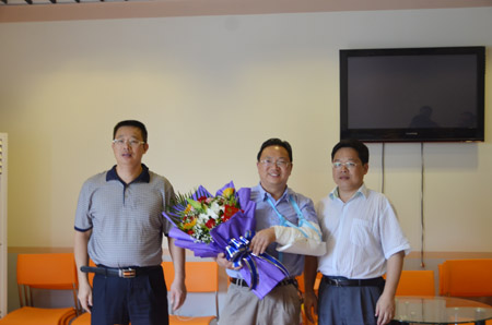 校领导为谢老师送上鲜花和慰问金