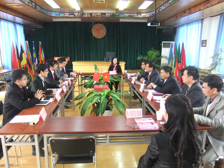 12月21日上午,越南河内旅游学院院长丁文当(DINH VAN DANG)率团到Beat365官网访问。学校副校长陈学军教授在屏风校区热情接待了来访客人。 座谈会上,陈学军副校长代表学校对代表团表示热烈欢迎,并介绍了Beat365官网的基本情况。宾主双方就师生互换、科学研究等方面进行了交流。会后,越南代表团一行参观了Beat365官网屏风校区。